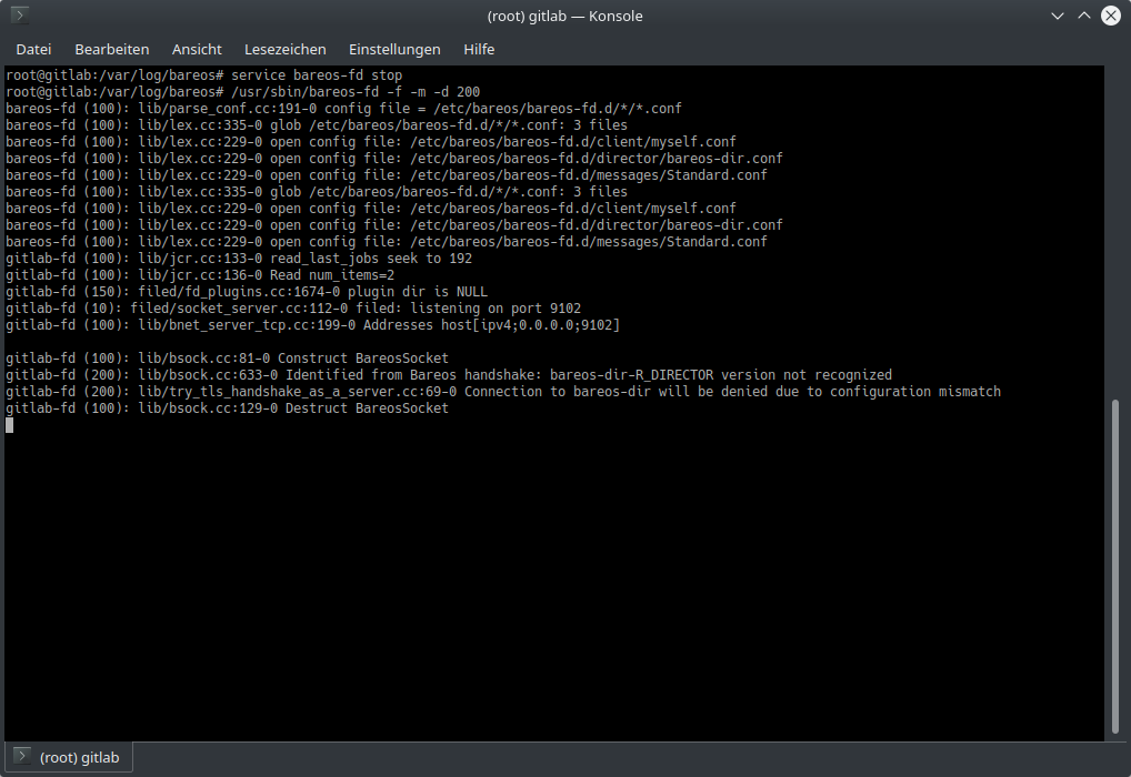 gitlab-fd (100): /lib/try_tls_handshake_as_a_server.cc:69-0 Connection to bareos-dir will be denied due to configuration mismatch