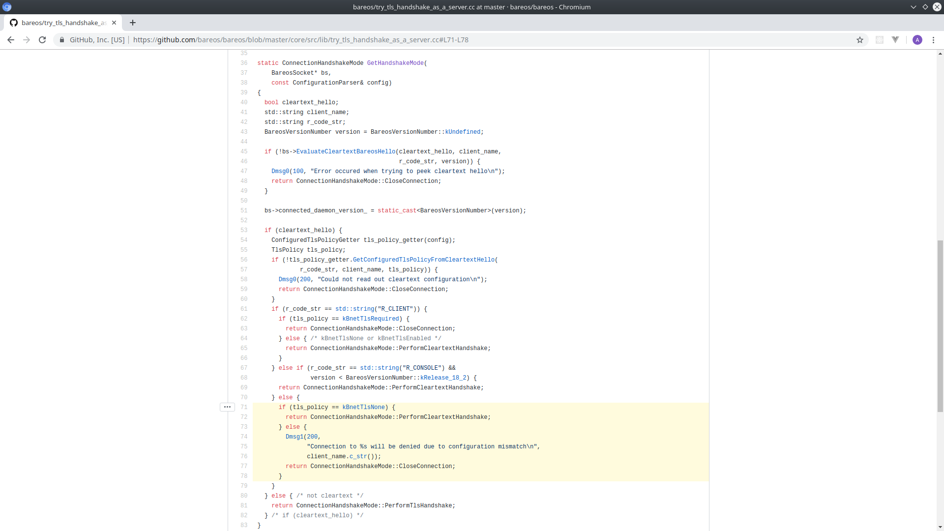 Jetzt kommt der interessante Part: Die Log-Meldung „will be denied due to configuration mismatch“ hat doch etwas mit TLS zu tun, obwohl ich es gar nicht aktiviert hatte. Wir sehen in der Datei try_tls_handshake_as_a_server.cc in der Zeile 71 (die Zeilennummern variieren natürlich etwas zwischen aktuellem Stand, master-Branch und meiner Version aus der Distribution), dass die Variable tls_policy eben nicht kBnetTlsNone ist bei mir. Mein Client erwartet eine TLS-Verbindung zum Director!