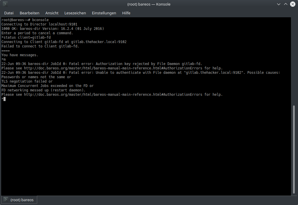 Bareos-Fehlermeldung: Unable to authenticate with File daemon at „gitlab.thehacker.local:9102“.