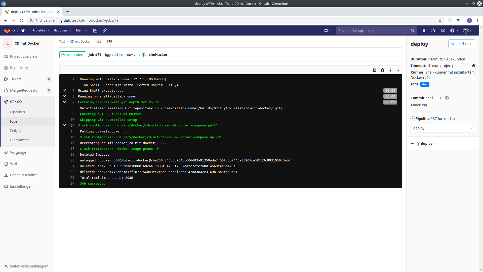 docker-compose pullaus. Dies weist Docker an, das Image nochmal von der Registry zu holen, selbst wenn es schon lokal da ist. Da wir uns in diesem Artikel überhaupt nicht um irgendwelche Versionsnummer gekümmert haben, sind alle Docker-Images immer mit dem Taglatestgekennzeichnet. Würden wir eine Änderung am Quellcode machen, würde zwar das neue Image an die Registry gepusht werden, beim Deployment würde Docker aber sagen „Hey,cd-mit-docker:latesthab ich doch schon“ und nicht die neue Version holen, sondern nochmal die alte Version deployen. docker-compose up -dstartet bzw. aktualisiert den Container. Diese Zeile ist die Magic, die wir schon die ganze Zeit verwendet haben. Nichts Neues hier.docker image prune -fweist Docker an, alle Images zu löschen, die nicht mehr in Verwendung sind. Jedes Mal, wenn wir eine neue Version beim Deployment aus der Registry holen, bleibt die alte Version auf der Festplatte liegen, da Docker intern nur Hashes benutzt, nicht die Tags. Irgendwann läuft uns dann die Festplatte voll. Docker hat normalerweise eine Sicherheitsabfrage drin, die wir mit-fübergehen.