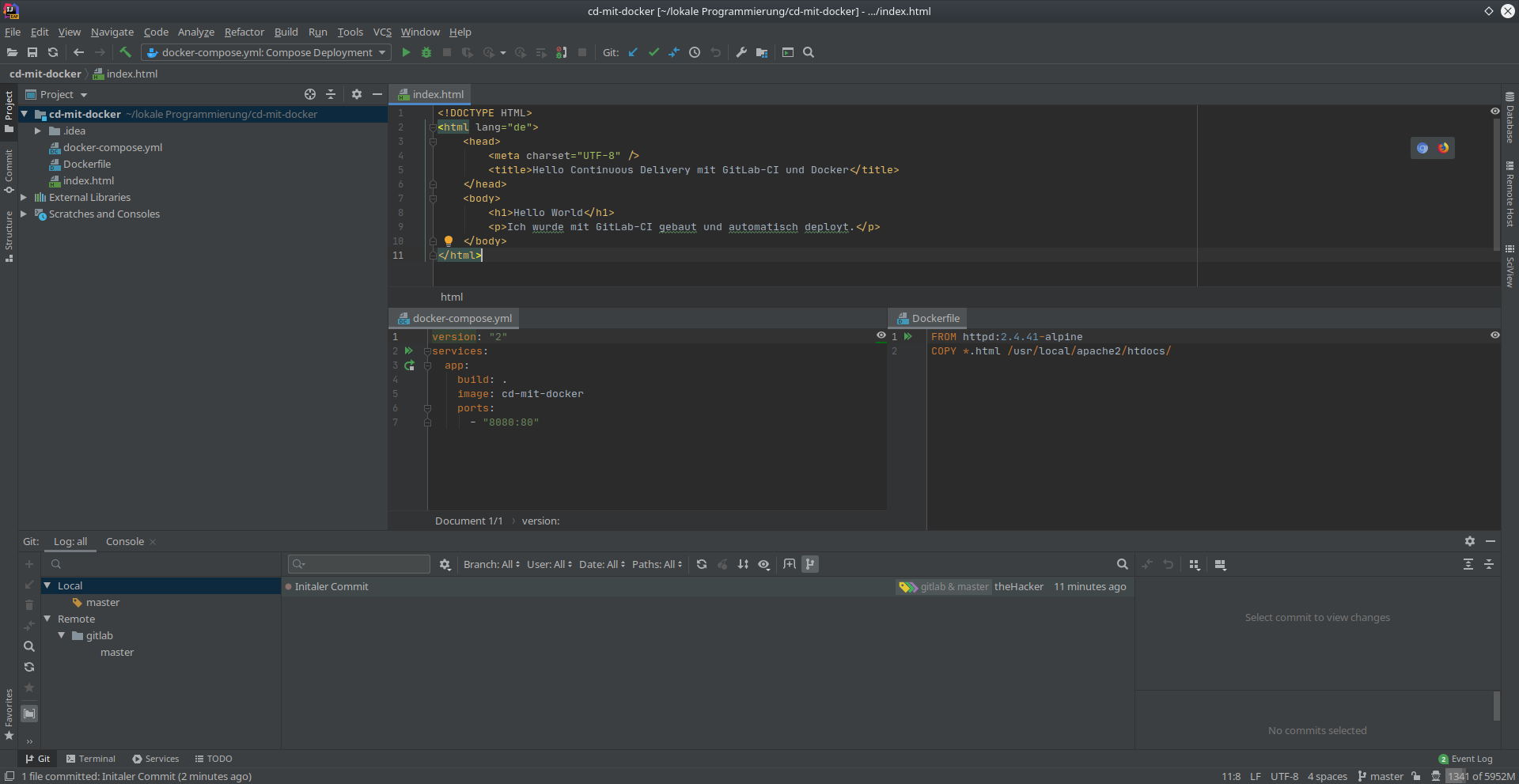 Ich ändere kurz die index.html, um zu zeigen, dass wir mit unseren Setup nun nichts mehr tun müssen. Nachdem ich die Änderung eingecheckt und gepusht habe, läuft wieder alles automatisch ab. Wenige Minuten später können wir die Änderung auf dem Docker-Host sehen.