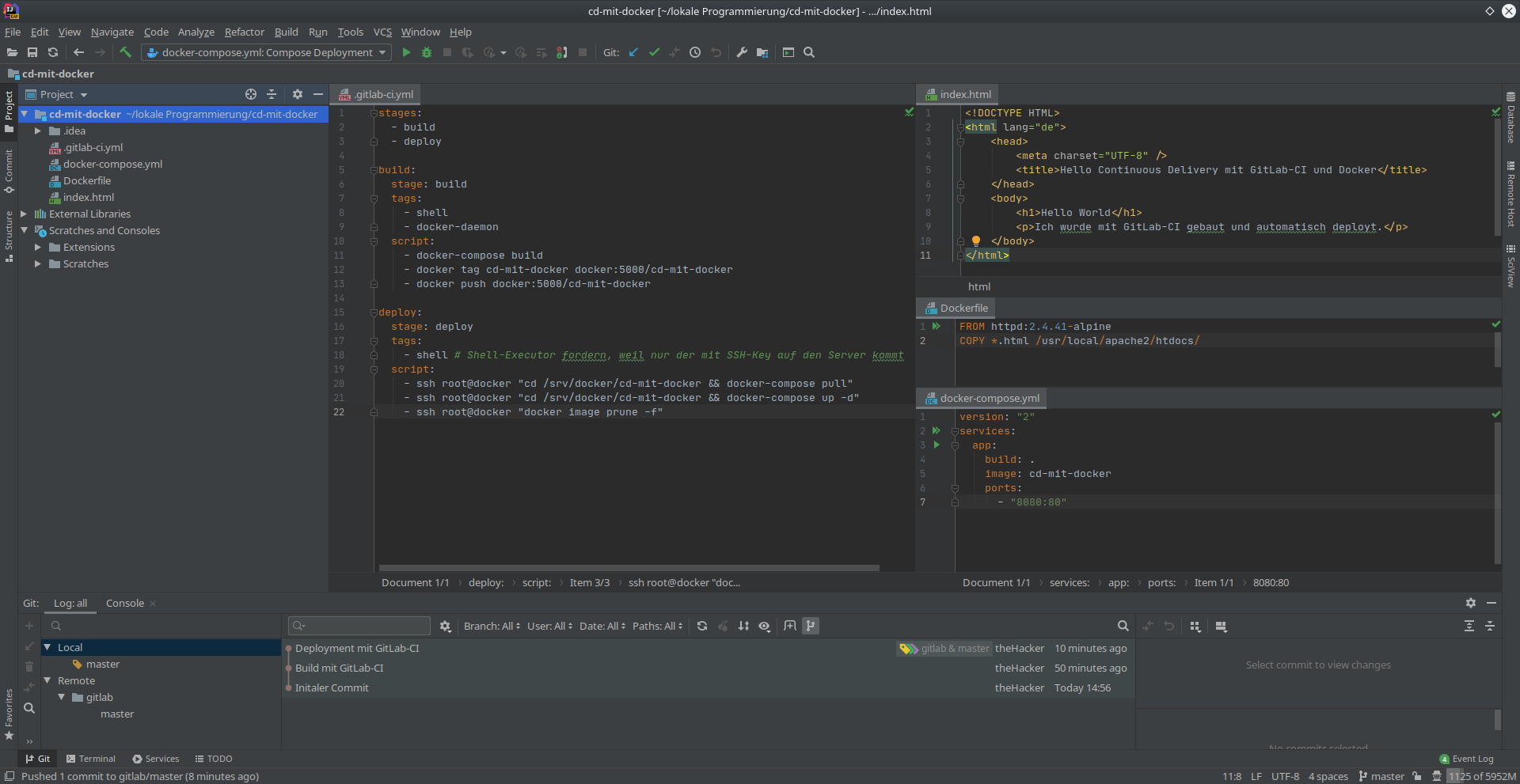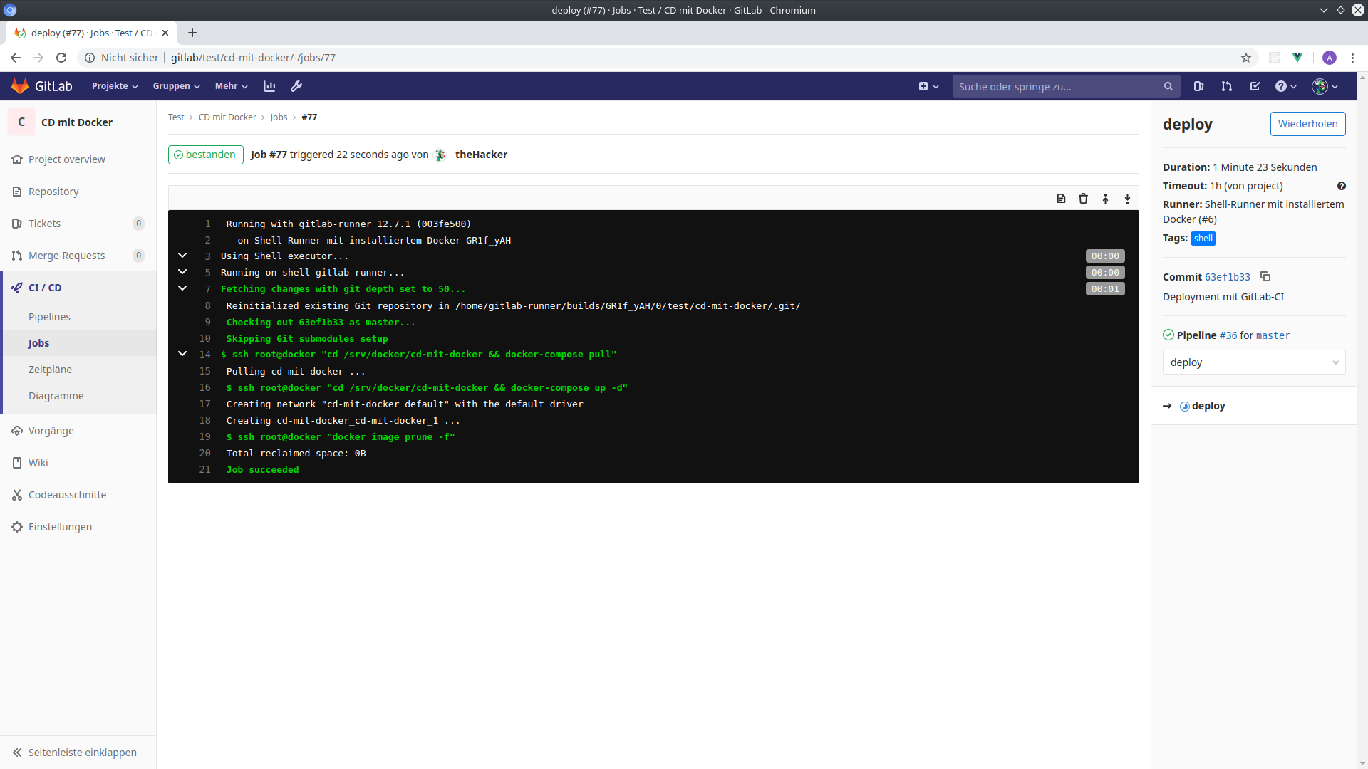Als letzten Schritt ergänzen wir unsere CI-Konfiguration um einen Deploy-Job, der sich per SSH einloggt und die docker-compose-Zeile ausführt: