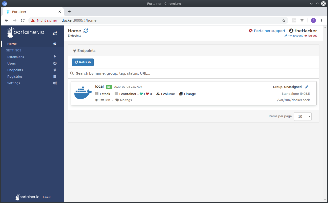 Einmalig beim ersten Start legt man Zugangsdaten für einen Administrator an und wählt die Verbindung zum Docker-Daemon aus („Local“, da wir das Socket gebunden haben).