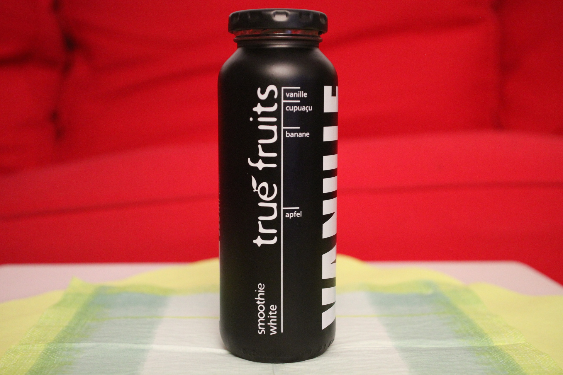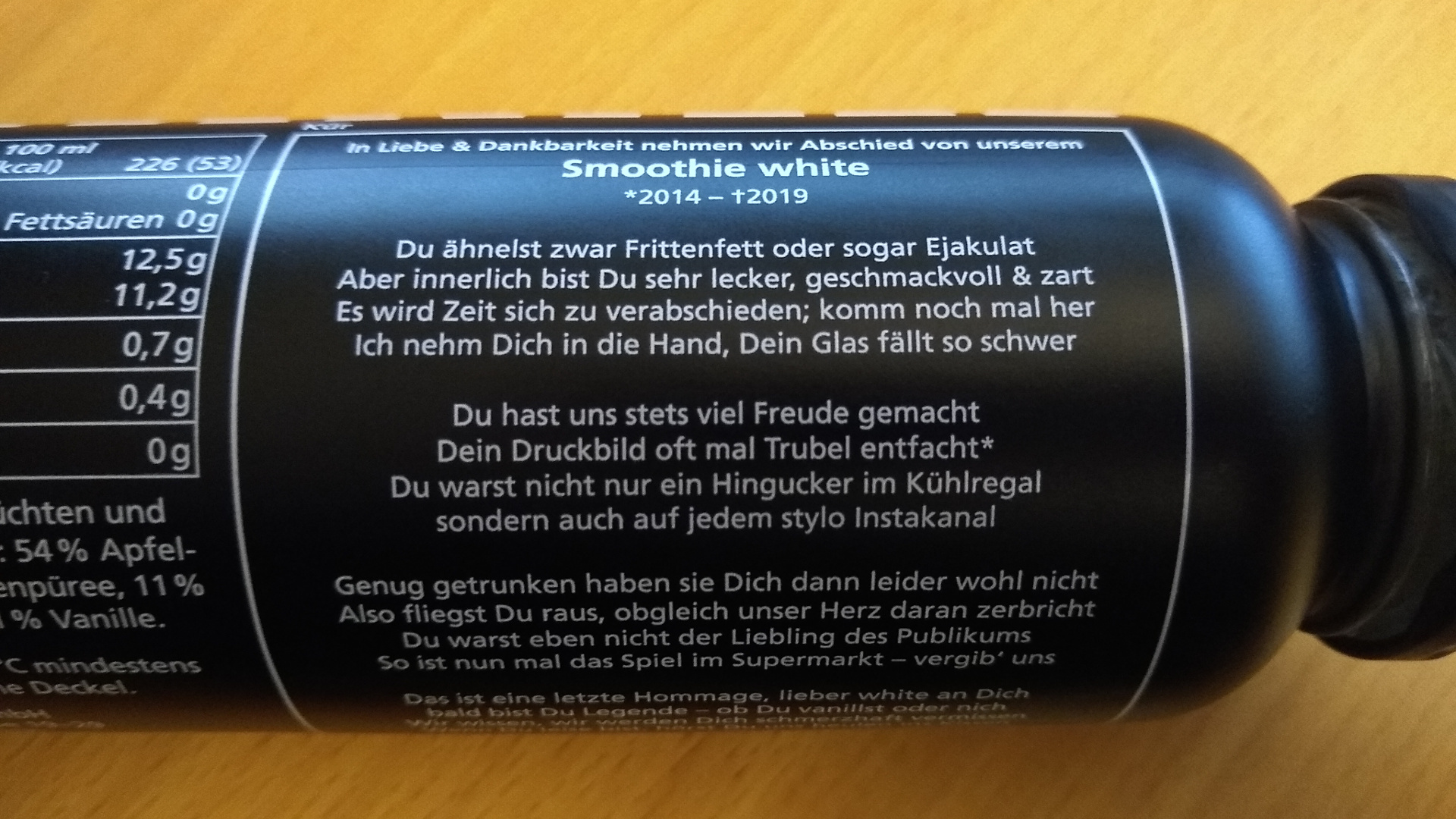 Ich möchte als Freund von Vanille und jemand, der eigentlich, wenn Smoothie, dann immer den Smoothie white gekauft hat, dem Produkt meinen Respekt zollen und den Nachruf veröffentlichen, den true fruits auf die Flasche gedruckt hat.